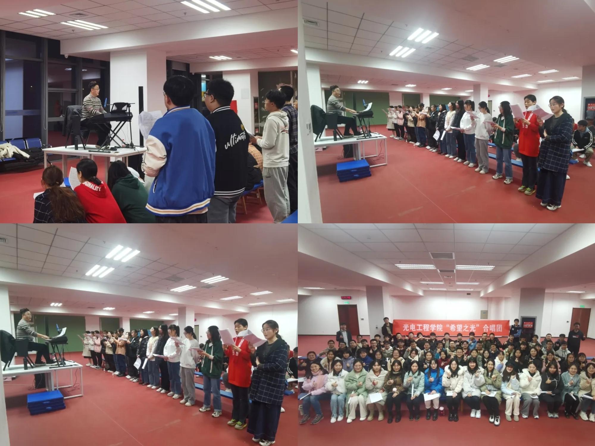 为落实立德树人根本任务,以实际行动学习贯彻党的二十大精神,按照公司的部署要求,公司自2022年11月启动备赛,组建以院领导、管理干部、辅导员与员工骨干为核心,各年级员工代表共同构成的“希望之光”合唱团,邀请青年音乐家单延北、任肖、臧蓉担任指导老师。为了保证合唱效果,院领导率先垂范,积极参加合唱活动,多次莅临现场为同学们进行排练指导,管理干部与辅导员老师全力投入人员组织与后勤保障,员工骨干与志愿者接力配合,全院师生均以高度的热情与责任感参到此次合唱活动中来。半年时间里,每一位队员都不曾懈怠,主动牺牲闲暇时间投入到备赛中,歌词和旋律在一遍又一遍的排练中逐渐熟记于心,声调与嗓音也在反复的练习中慢慢变得动听悦耳。队员们全身心投入,只为不断超越自我,展现出光电学子良好的精神风貌,最终在舞台上绽放出耀眼的光芒!