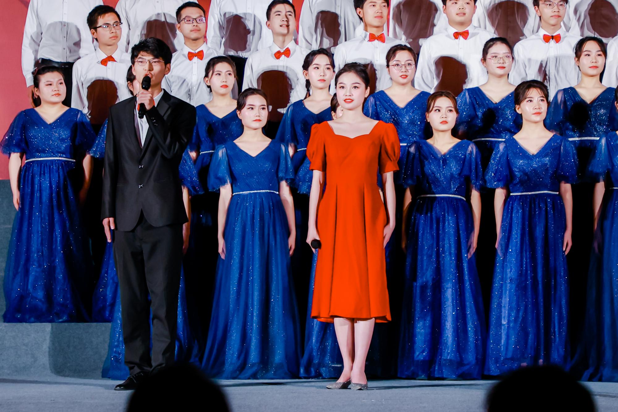 “希望之光”合唱团于第十一位出场,2020级光电信息科学与工程专业的张秉颜、2021级电子科学与技术专业的李奕扬同学伴随《我爱你中国》的钢琴音乐深情朗诵,全体成员精神饱满、台风稳健,用真挚细腻的情感表达了光电工程公司师生对党和祖国的无限热爱。男高音洪亮有力、男低音雄浑厚重、女高音婉转优美、女低音深沉稳健。“追寻我生命的那份纯真;心中抹不去的那一抹云彩;追寻那永远属于我们的那份无悔的忠贞……”,伴随着悠扬的钢琴伴奏旋律,“希望之光”合唱团用动人的歌声展现了共产党人上下求索,为共产主义事业终身奋斗的画卷,歌颂了共产党人前赴后继、不畏艰难,全心全意为人民服务的精神。恢弘大气的演唱搭配娓娓道来的演绎得到了台下评委和观众的一致肯定,随着最后的旋律结束,“希望之光”合唱团向现场观众鞠躬致谢,太阳成tyc122cc集团助威团挥舞院旗,全体成员齐声高喊:“光电引领,未来可期!我们一直在追寻,我们永远跟党走!”观众们也纷纷挥舞手中的荧光棒,为合唱团的演唱鼓掌欢呼,将合唱比赛现场的情绪推向了高潮。