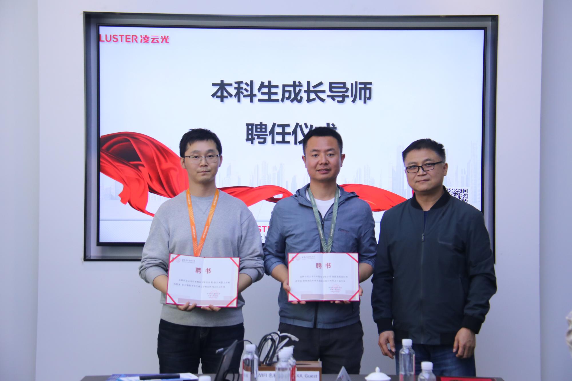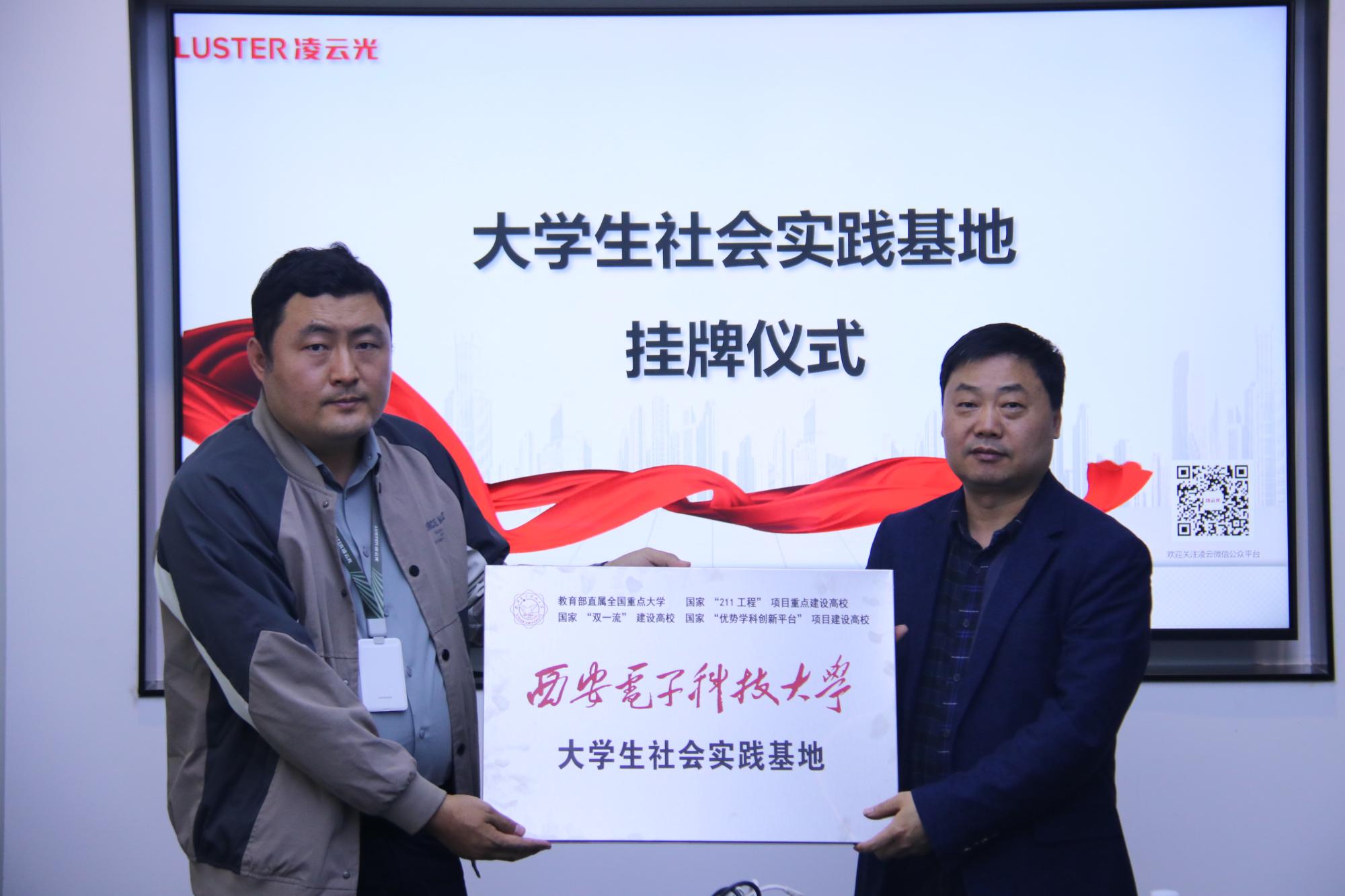 随后,独国社、任晓伟共同为“老员工社会实践基地”挂牌。西电员工唐雷雷和杨晓龙分享了在凌云光的工作经历和感悟,并对现场同学的疑惑一一解答,从专业技术,薪资待遇,招聘实习以及公司后勤保障等方面为同学们提供了成长发展的宝贵建议。郑晓东为两位员工颁发公司“本科生成长导师”聘书。双方还就加强供需对接、推动员工就业实践等内容进行了深入交流。