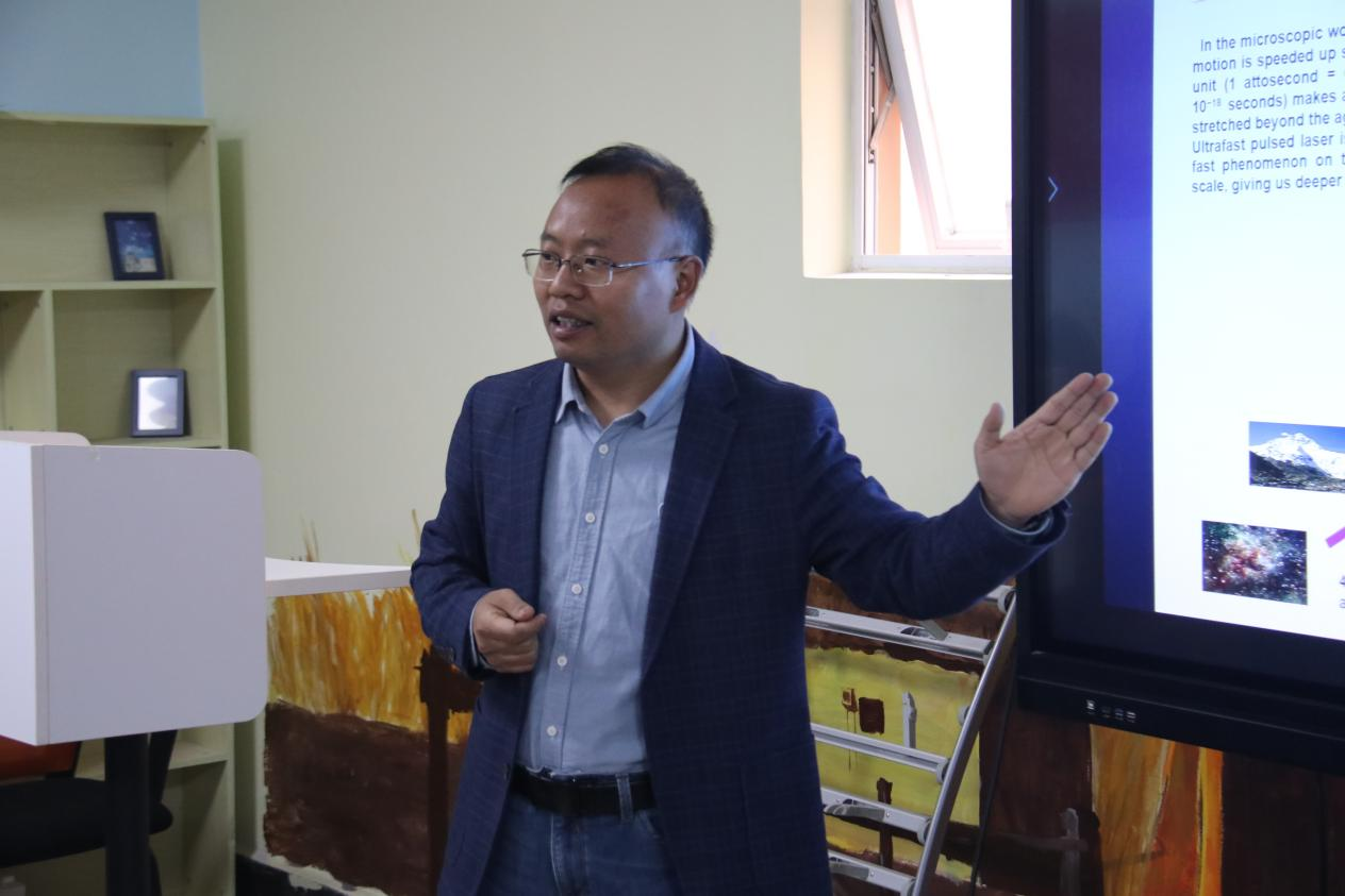 朱江峰教授立足团队研究方向及2023年诺贝尔物理学奖,以《接近2023年诺贝尔物理学奖——从飞秒到阿秒》为题,向同学们介绍了皇冠明珠——超快超强激光及其前沿科技、大科学装置与先进应用的情况。他向同学们讲解了超快激光的显著特性,并将阿秒相对于心跳与人生相对于宇宙进行类比,以展示阿秒之快,朱江峰老师生动形象的表述使深奥的专业知识变得浅显易懂。