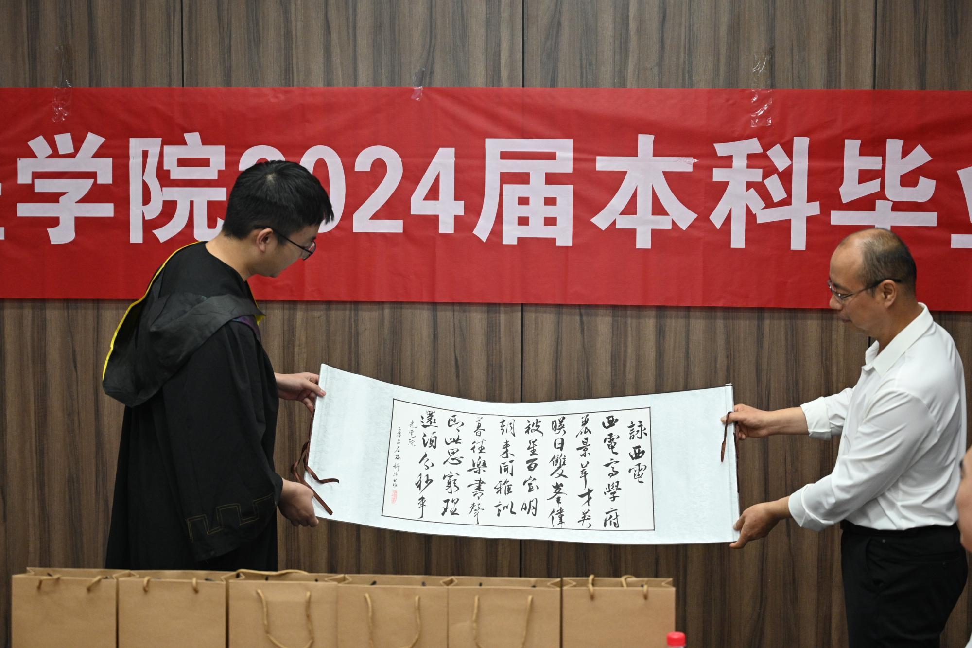 会上,周张翼代表全体毕业生向公司赠送了书法作品《咏西电》,以此表达学子们对于母校培养的感激之情。黄小强和杨威代表公司为毕业生赠送毕业礼物。