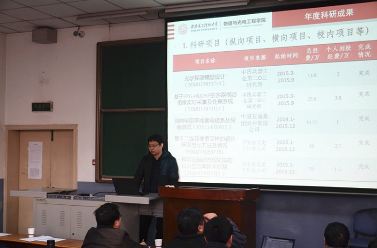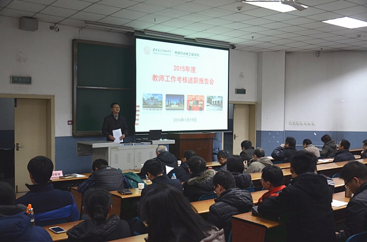 1月19日上午,物理与公司在北校区阶教505举办2015青年教师年度考核总结述职报告会,公司45周岁以下青年教师逐一上台,详细汇报个人一年来的工作情况。报告会由公司党委书记杨光暐主持。