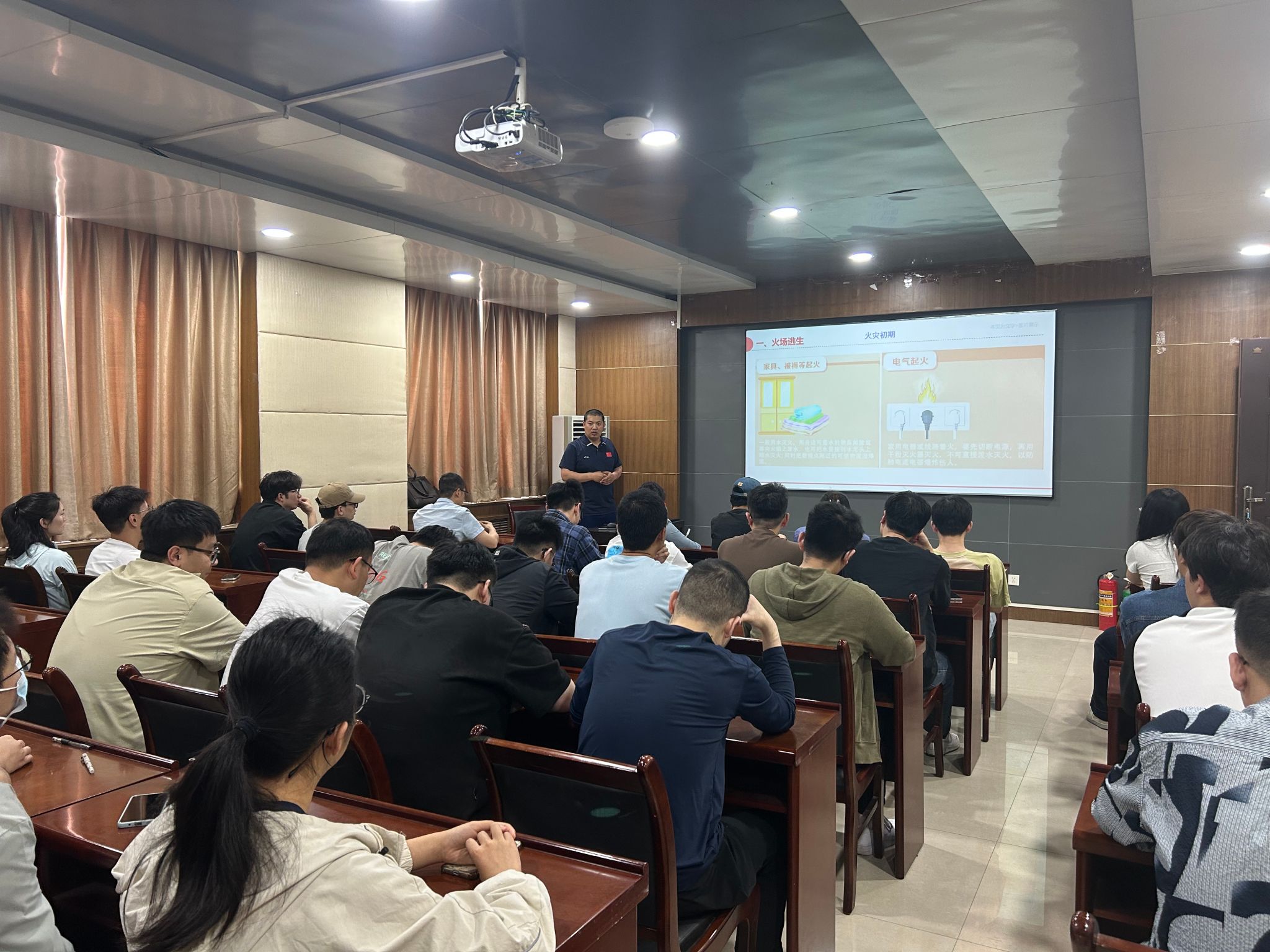 随后,校消防站史凯源老师结合真实案例详细讲解了火灾预防、火情识别、灭火的基本方法以及火场逃生要点,同时结合公司实验室安全管理的实际情况,重点讲解了实验室安全疏散及危险化学品泄漏事故的应对方法。他强调,进入公共场所应首先熟悉安全出口和疏散路线,做到心中有数,当火灾发生时务必保持冷静,谨记“小火快跑,浓烟关门”应急要领,在疏散时应注意防护避免摔伤。公司师生应时刻保持警惕,强化消防安全意识,坚持“安全第一,预防为主”的原则,将消防安全隐患消除于萌芽状态,做到防患于未然。