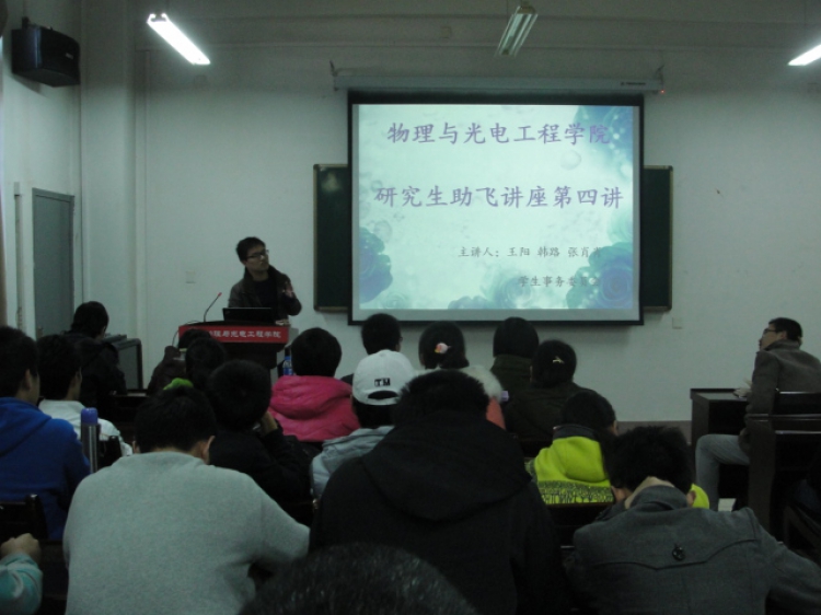 (通讯员:武彩玲 郭晋全)11月30日下午14:00,物理与太阳成tyc122cc集团研究生助飞系列讲座第四讲在E楼III区315报告厅举行。第四讲特别邀请韩路、张肖肖、王阳三位研究生主讲,本科2013级近200名同学参加了此次讲座。