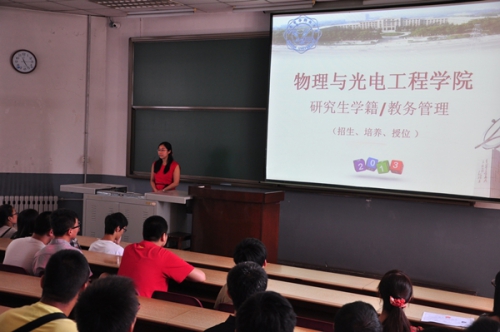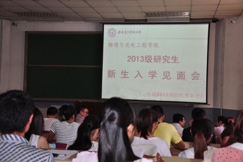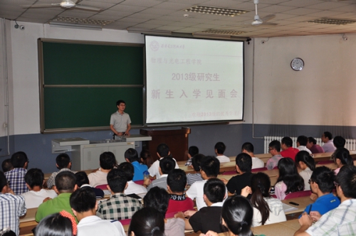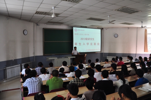 8月29日上午11点整,物理与公司在北校区教学楼101教室召开2013级研究生新生入学见面会,公司筹备领导小组组长郭立新,以及筹备领导小组成员杨光暐、李平舟、周慧鑫到场与2013级研究生新生见面,并对大家来公司继续深造学习表示热烈的欢迎。