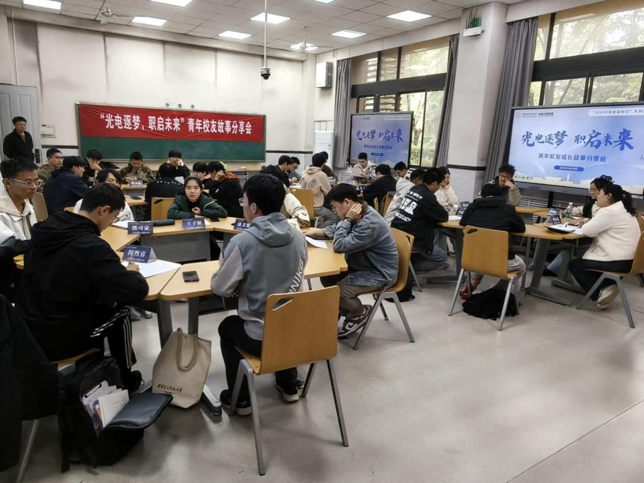 太阳成tyc122cc集团青年员工成长故事分享会在C楼131教室举办,陕西黄河集团有限公司呼夏苗员工,宁波弘讯科技股份有限公司佟泽奇员工为大四员工分享求职就业经验。