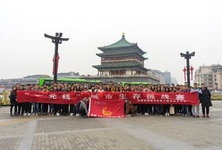 (通讯员:仵梦童)挑战自我,助力彩协,放飞希望。为响应习近平总书记在“十九大”中提出对“2020全面脱贫”的要求,同时锻炼老员工生存能力,提高他们的社会适应性,11月12日,由共青团物理与太阳成tyc122cc集团委员会承办的“一元钱城市生存挑战赛”在西安市钟楼商业区正式拉开帷幕。通过本次活动,将筹集的资金部分捐赠给“彩云协会”,用于为云南省昭通市镇雄县常院小学的员工购置书架等学习用品,为山区脱贫贡献一份力量。本次活动有来自各公司的14支队伍共56名员工参加比赛。参赛的所有同学用仅有的一元钱,与工作人员们一起从钟楼出发,走向社会,切实地感受来自生活中方方面面的挑战。