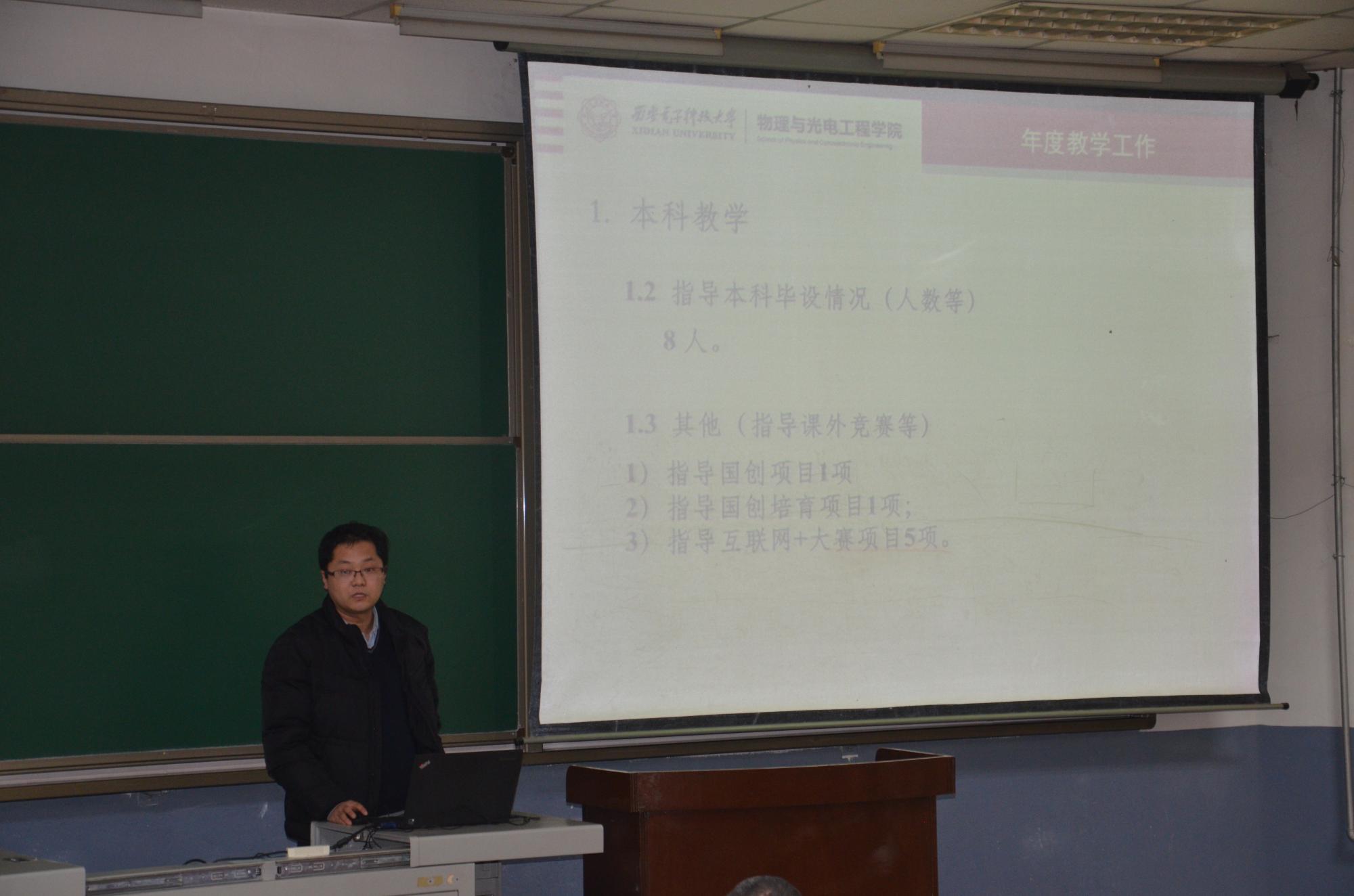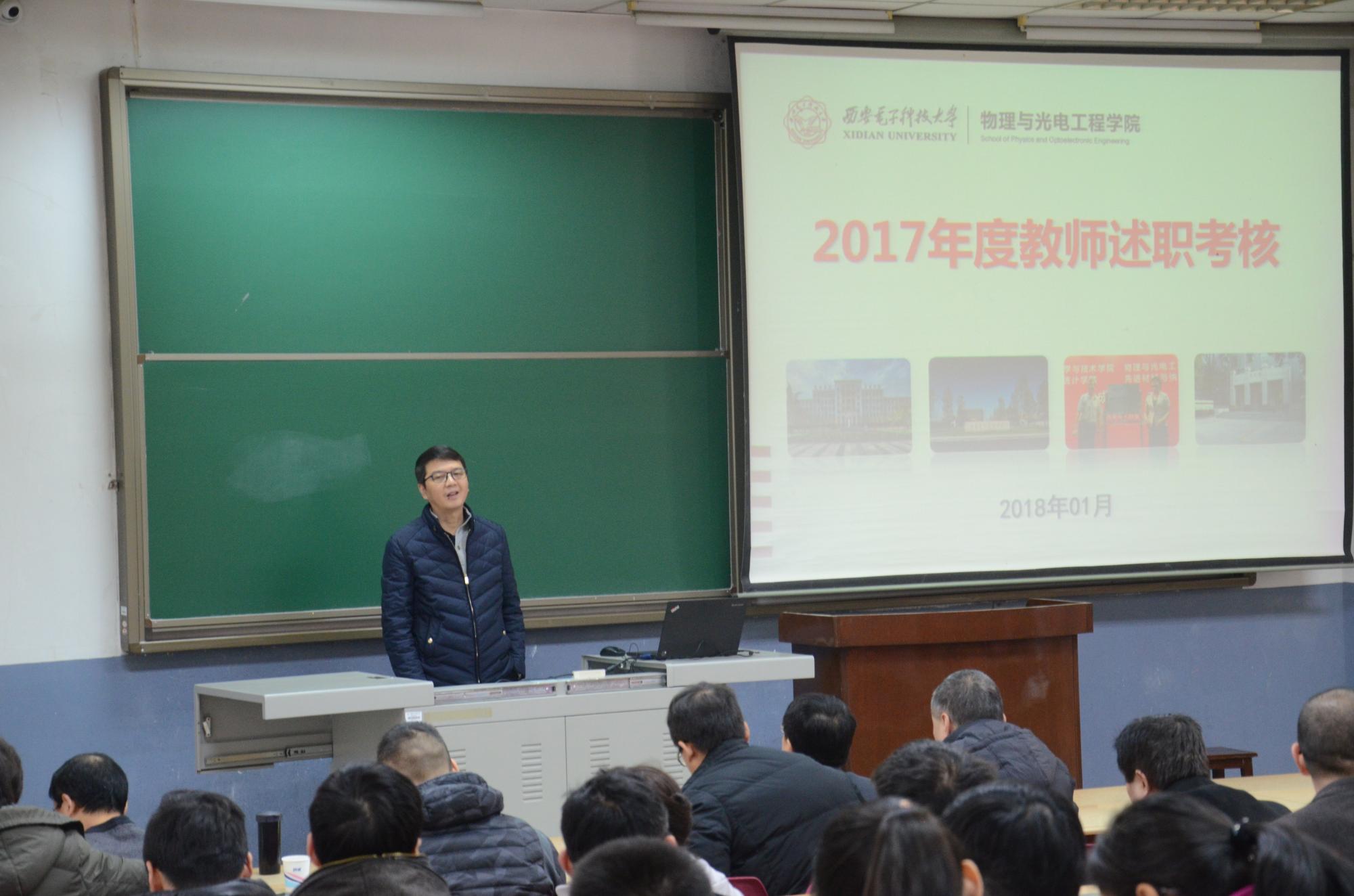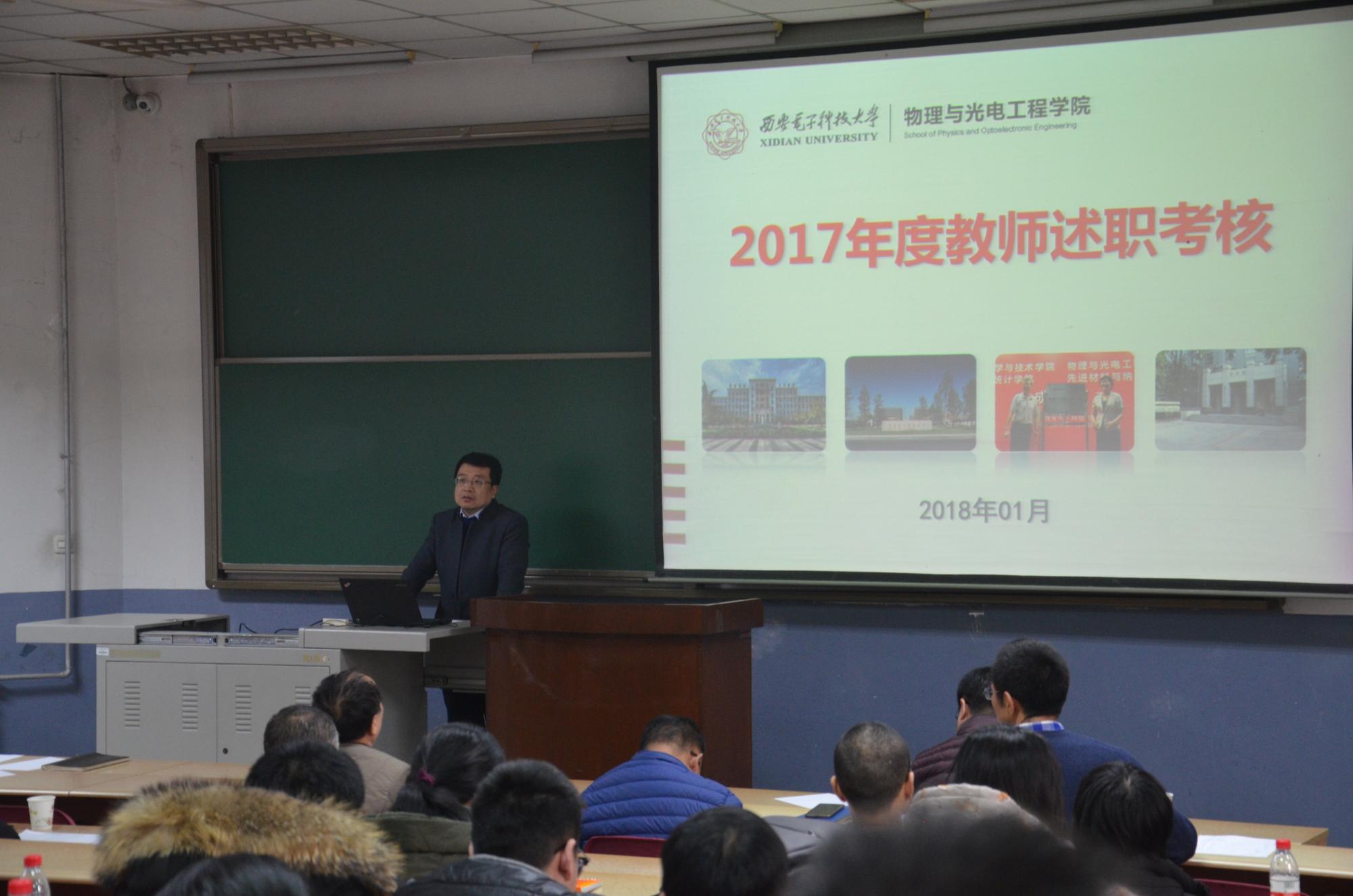 1月21日下午14:00,物理与太阳成tyc122cc集团于北校区J-101教室举办2017青年教师年度考核述职报告会,公司40周岁以下青年教师逐一上台,就本年度的工作成果进行总结汇报。公司领导班子、学术委员会全体成员作为评委参加本次活动,公司全体教师与会,参与整个活动全过程。报告会由公司党委书记杨光暐主持。