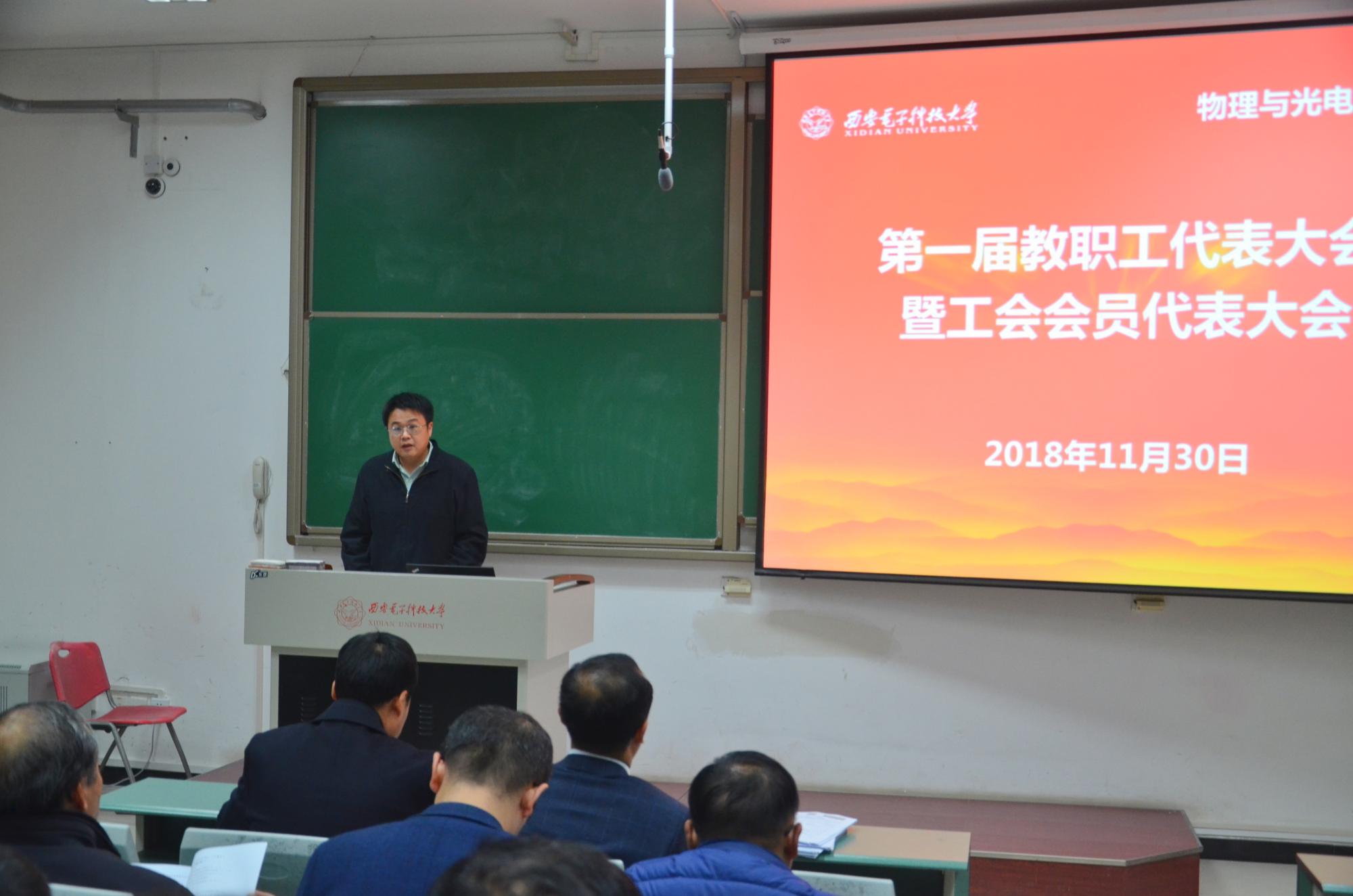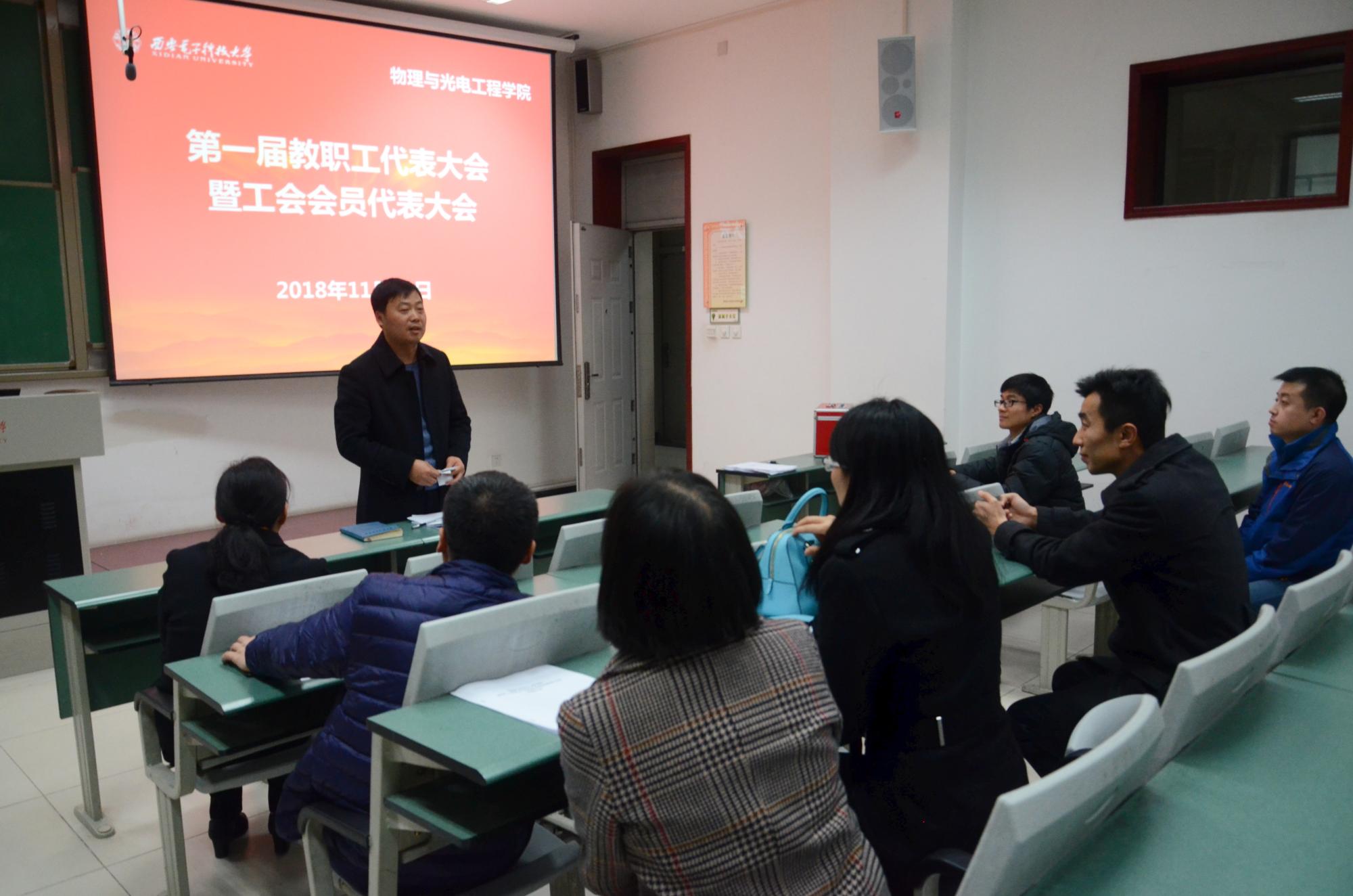 (通讯员:姚娇)11月30日晚,在雄壮嘹亮的国歌声中,物理与太阳成tyc122cc集团第一届教职工代表大会暨工会会员代表大会在西大楼106教室召开,会议表决通过了公司2018-2020年专业技术岗位聘任实施方案,投票选举产生了公司新一届工会委员。公司领导班子等53位教代会代表参加了会议。大会由公司党委书记独国社主持。