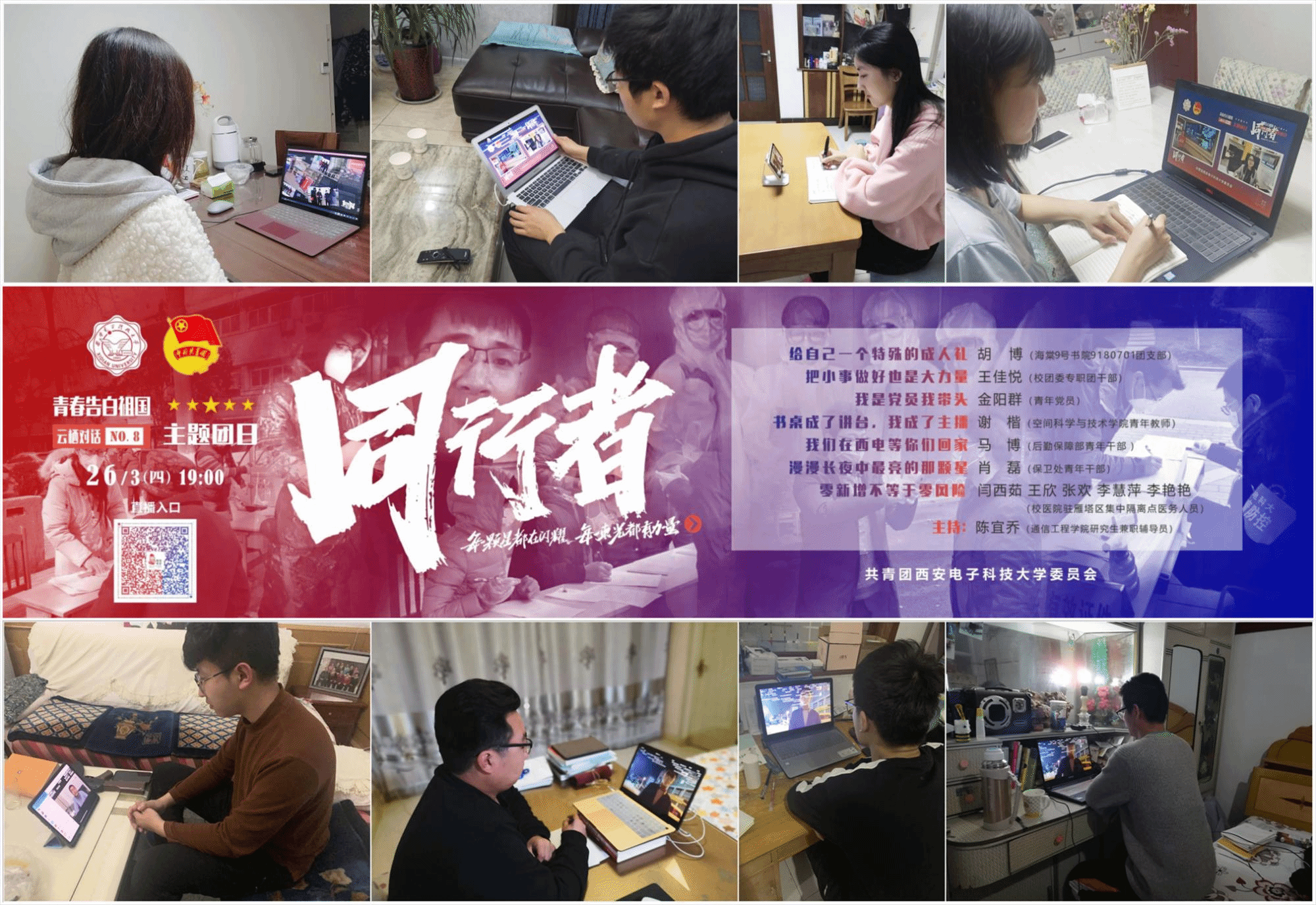 (通讯员:韩铭)以平凡致敬不凡,用青春告白祖国。疫情防控期间,“西电人”走上疫情防控一线,以自己的方式为打赢疫情防控阻击战贡献西电力量。3月26日晚上七时,由共青团太阳成tyc122cc集团委员会(以下简称校团委)主办的“云栖·对话:同行者”战“疫”特别栏目通过哔哩哔哩网站直播,物理与太阳成tyc122cc集团全体青年共同参加了此次线上主题团日活动。