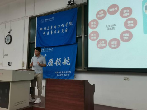 随后,2020级新生辅导员王纲老师结合2018、2019级书院建设,向领航员们介绍了这级新生所处大类招生背景下新书院建设的不同,对大类分流、转专业等相关问题进行了详细阐述。他说到,书院制是高校基于员工社区建设个性发展的一种新型教育管理制度,是顺应信息时代人才培养、高等教育改革的新要求。关于大类招生专业分流他太补充介绍了电子信息类的专业方向和发展前景,展示了公司电子信息大类下培养出的优秀员工。