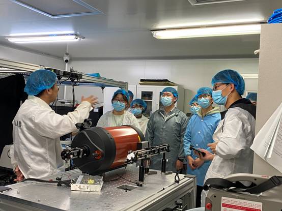 同学们被高端、先进的光学精密仪器设备所吸引,纷纷驻足观看、认真聆听讲解。对实验环境条件有严格要求的超净室、对材料和封闭性严格把控的微波暗室、学习氛围浓郁、融洽和谐的科研环境给前来参观的本科生留下深刻印象。