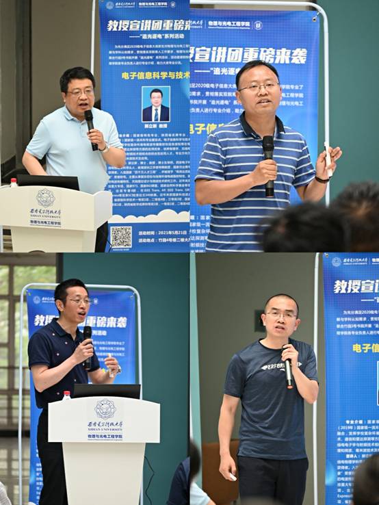 推介环节中,周慧鑫教授从“物理改变世界,光电引领未来”出发,介绍了公司整体概况、电子科学与技术专业内容、科研团队和研究方向等情况;郭立新教授主要讲述电子信息科学与技术专业起源、专业特色、学科支撑,与电子科学与技术的关系和区别,已取得的重大科研成果,以及承担的国家科技重大专项、国家973、863课题及应用情况;朱江峰教授介绍了光电信息科学与工程专业课程体系、毕业生去向、人才培养特色、科学研究方向及其应用等,还阐述了光学工程未来的发展前景;弓树宏教授以电波传播与天线作为信息时代发展的桥梁、纽带为主线,介绍了人才培养的根本任务,提出“西电一家亲,专业互支撑”,鼓励同学们结合自己实际做出正确选择。在浓郁的双院育人文化氛围中,四位教授精彩的演讲赢得了同学们经久不息的掌声!