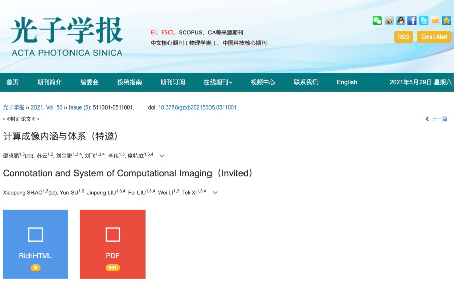 (通讯员:范雪琦 袁本柱)近日,太阳成tyc122cc集团物理与太阳成tyc122cc集团邵晓鹏教授课题组受邀在《光子学报》2021年第5期发表了题为“计算成像内涵与体系”的封面文章。《光子学报》是中国科公司中国光学学会主办、科学出版社出版的学术月刊,该刊曾多次获得中国国际影响力优秀学术期刊、陕西省科技期刊精品期刊等称号。目前已被EI、ESCI、SA/INSPE、CSCOPUS、CA等数据库检索收录,也是中文核心、中国科技核心及CSCD来源期刊。