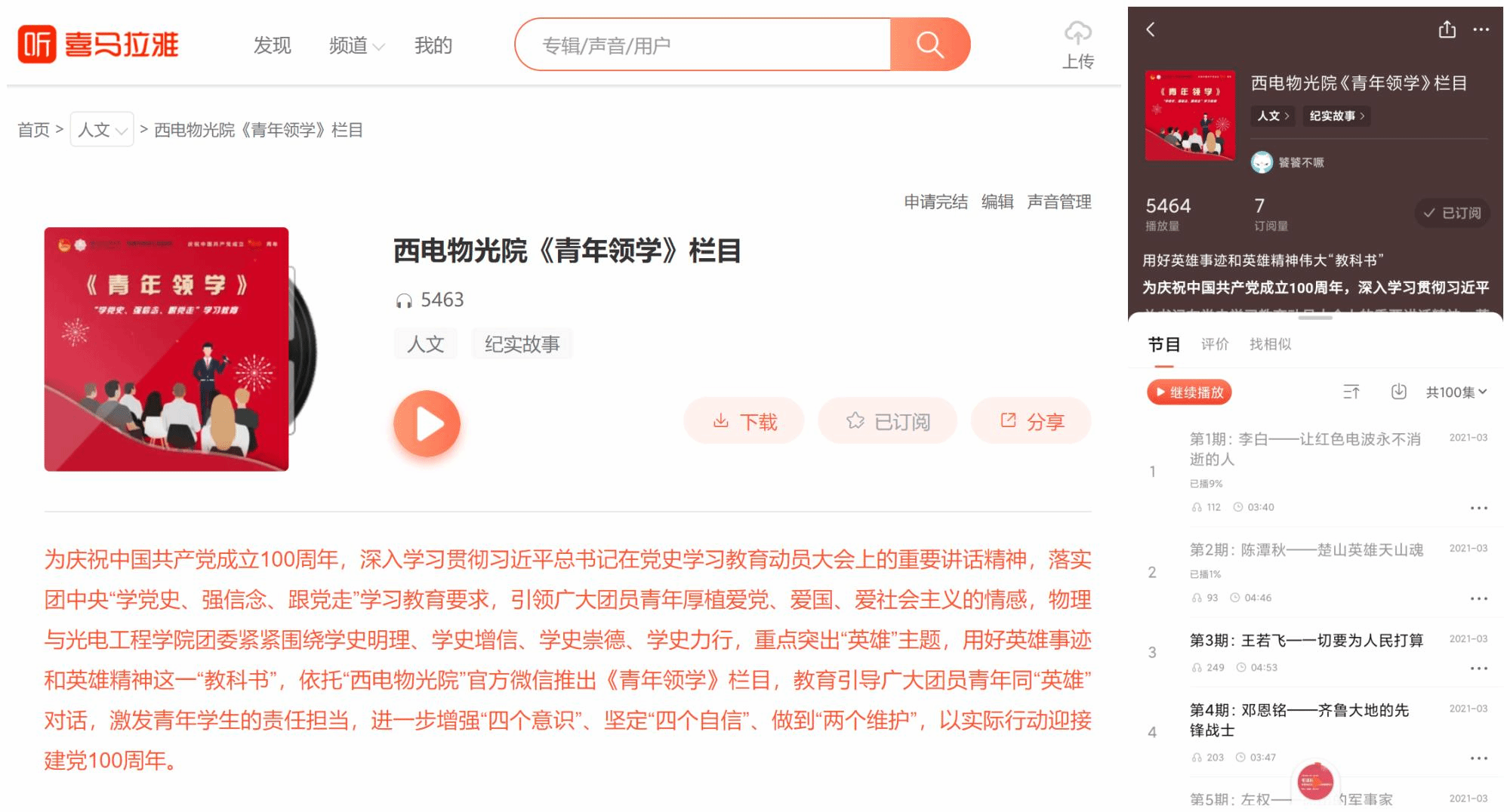 喜马拉雅FM:西电物光院《青年领学》栏目