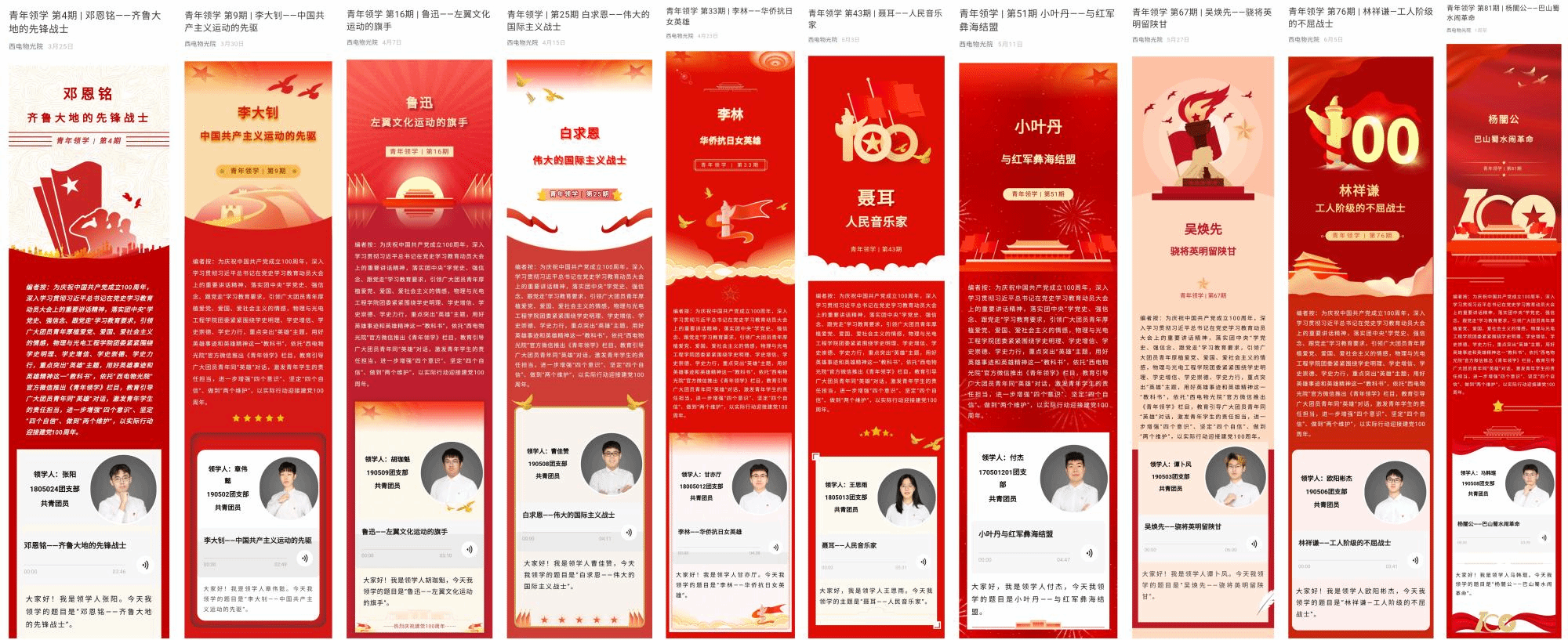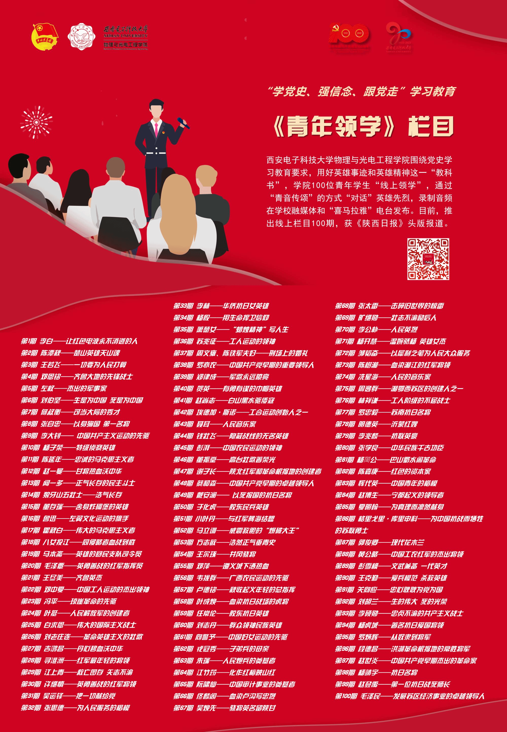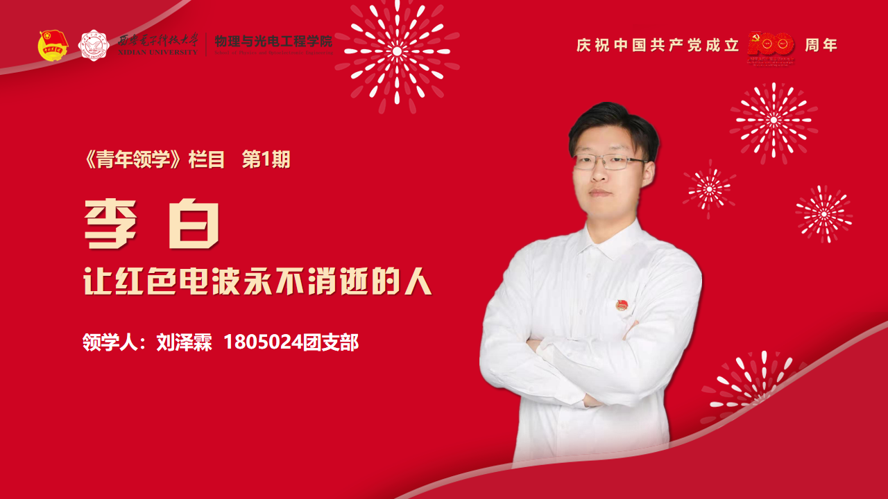 编者按:为庆祝中国共产党成立100周年,深入学习贯彻习近平总书记在党史学习教育动员大会上的重要讲话精神,落实团中央“学党史、强信念、跟党走”学习教育要求,引领广大团员青年厚植爱党、爱国、爱社会主义的情感,物理与太阳成tyc122cc集团紧紧围绕学史明理、学史增信、学史崇德、学史力行,重点突出“英雄”主题,用好英雄事迹和英雄精神这一“教科书”,依托“西电物光院”官方微信和“喜马拉雅FM”电台推出《青年领学》栏目,教育引导广大青年同“英雄”对话,激发青年员工的责任担当,进一步增强“四个意识”、坚定“四个自信”、做到“两个维护”,以实际行动迎接建党100周年。