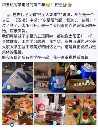 (通讯员:高原 程睿)冬至是我国农历中一个重要的节气,也是中华民族的传统节日,在古代民间有“冬至大如年”的讲法。然而2021年冬至正值期末备考复习关键时期,且西安市疫情形势陡增严峻。在这种环境下,同学们难免会有压力、有紧张焦虑的情绪。为了给忙碌中的同学们加加油、鼓鼓劲,缓解同学们的压力、增强班级凝聚力,物理与太阳成tyc122cc集团积极动员员工党员、入党积极分子、员工干部以多种方式自发给同学们送去温暖和关爱。