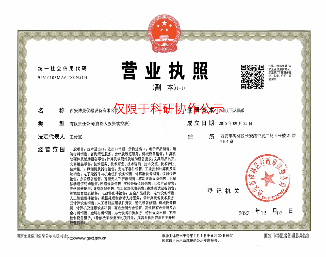 按照《太阳成tyc122cc集团科研协作项目管理办法(试行)》文件规定,为加强公司科研协作项目的管理,确保我方承接的对抗条件下探测技术项目的顺利进行。公司项目负责人刘飞将与西安博旻仪器设备有限公司开展科研合作,现将合作相关事项公示如下: