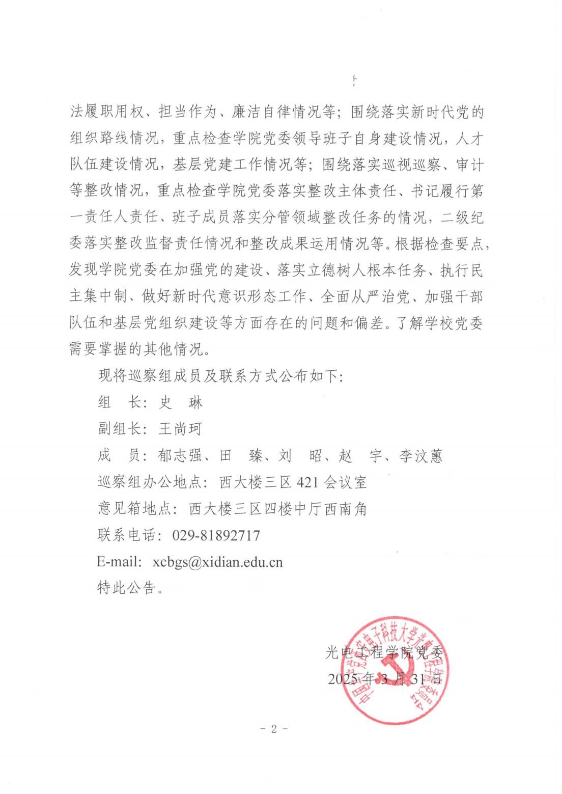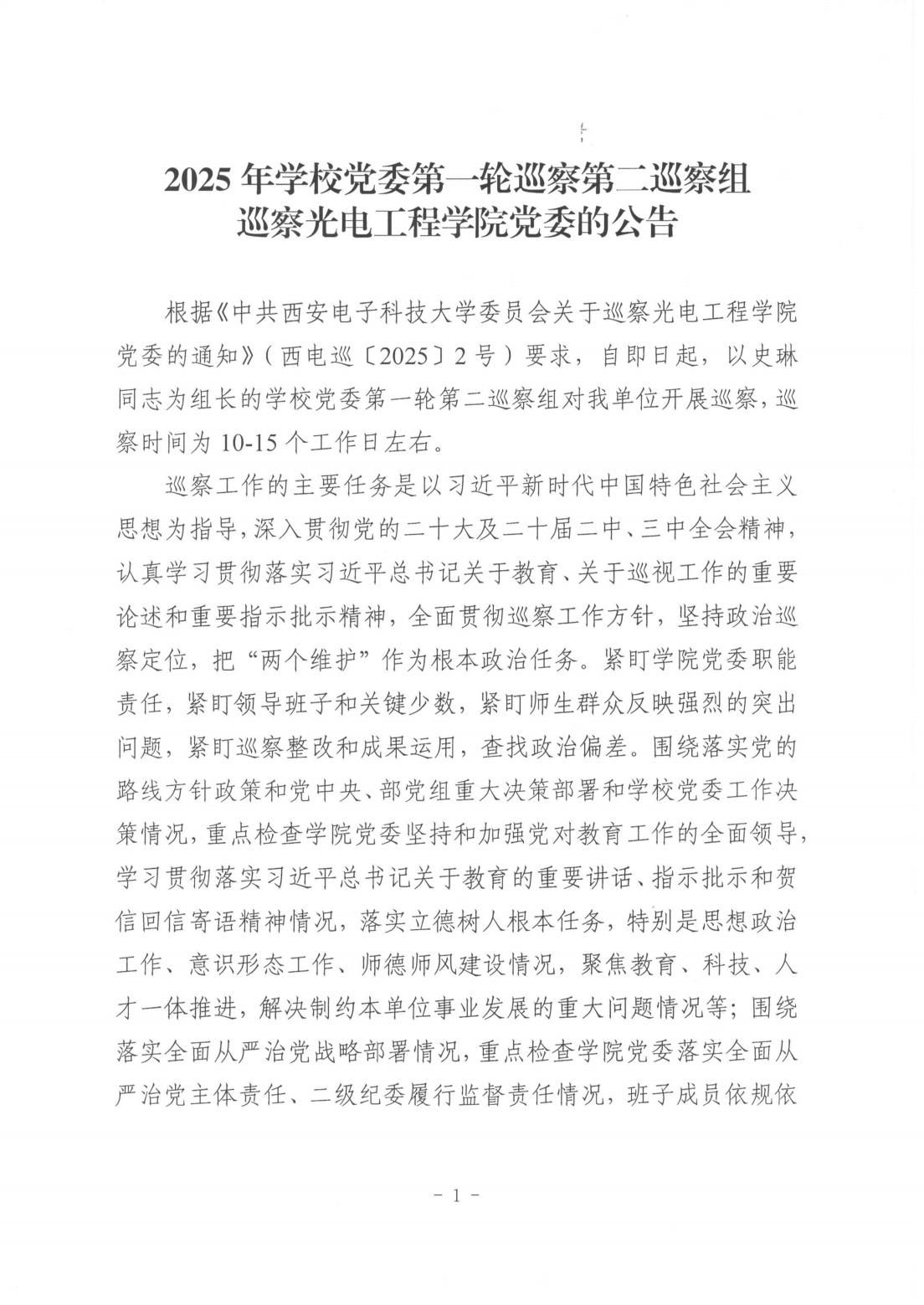 2025年公司党委第一轮巡察第二巡察组巡察光电工程公司党委的公告