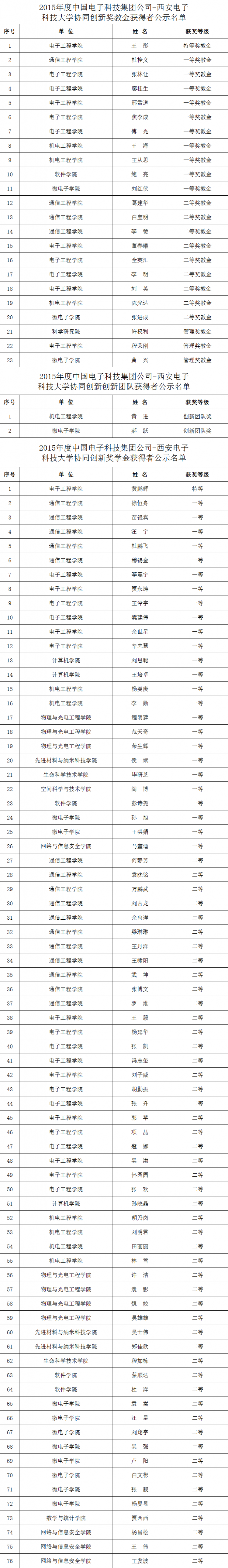2015年度中国电子科技集团公司-太阳成tyc122cc集团协同创新奖教金获得者公示名单