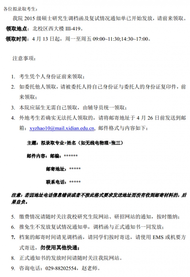 【通知】关于发放2015级硕士研究生复试情况通知单与调档函的通知