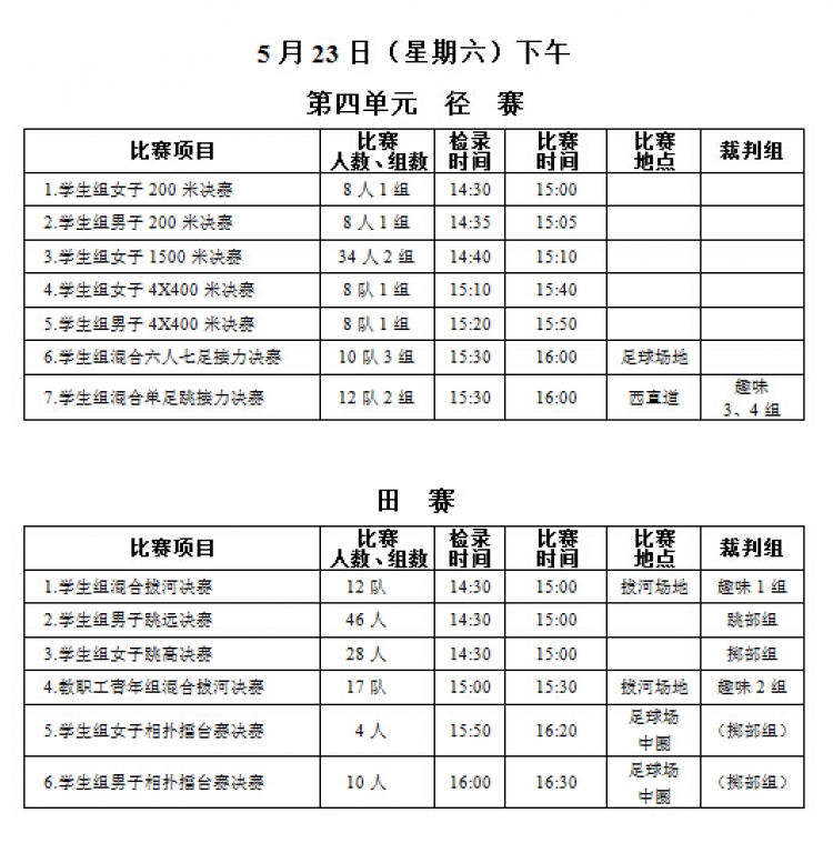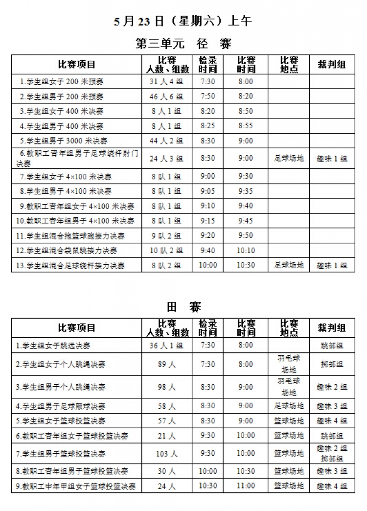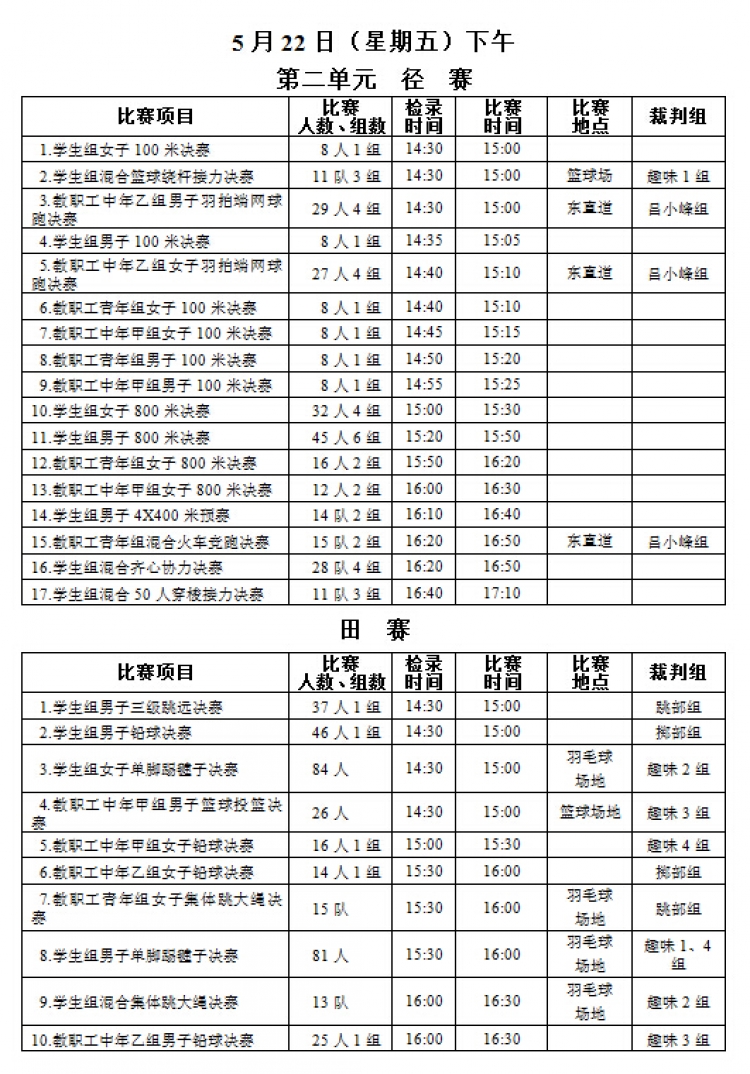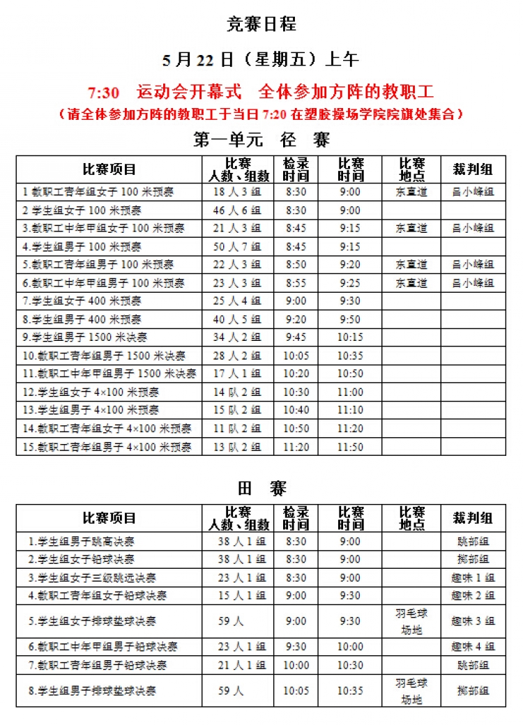 “公司举015年教职工运动会”将于本周五、六两日(5月22、23日)在新校区塑胶操场举行,现将《赛程安排》公布如下,请各系室工会组长通知各位选手(参照《西电科大运动会物光院参赛名单》,查看网址:http://stp.xidian.edu.cn/view-1194.html)提前做好参赛准备,着公司统一运动服按时参赛,同时,也鼓励未参赛教职工前来观看,为公司加油打气!请相互转告。