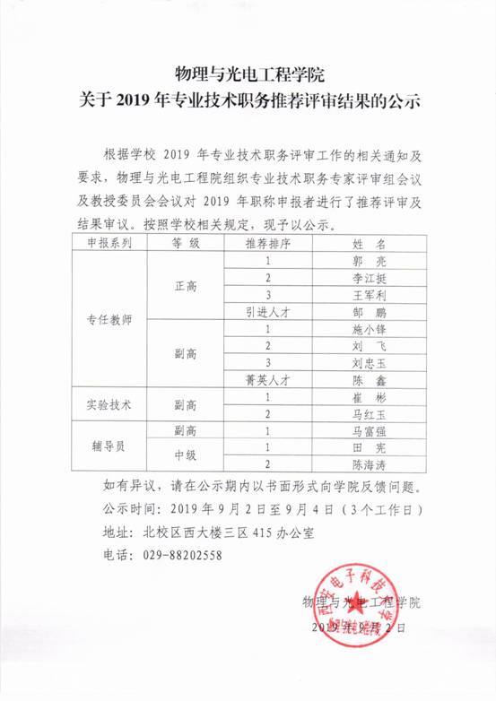 物理与公司关于2019年专业技术职务推荐评审结果的公示