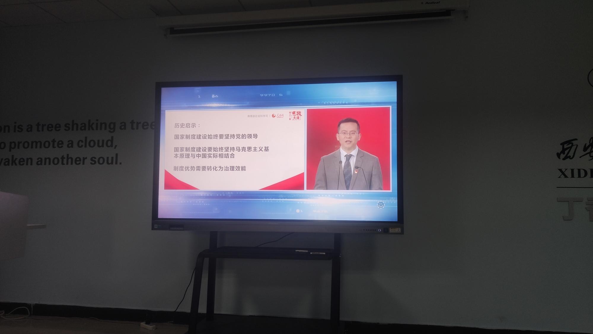 在思政课的最后,肖存良教授从制度层面给出了三点历史启示:一是国家制度建设始终要坚持党的领导;二是国家制度建设要始终坚持马克思主义基本原理和中国实际相结合;三是制度优势需要转化为治理效能。