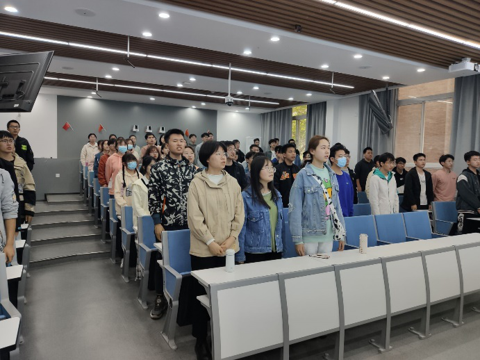 首先,与会成员全体起立,在庄严的伴奏声中唱响国歌,国歌不仅承载着家国情怀,更让同学们在歌声中,进一步寻初心悟思想,厚植爱国情怀,弘扬爱国主义精神。
