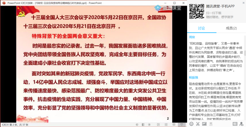 在授课互动环节,同学们纷纷发表了自己的学习感想。王好千同学说道:政府工作报告中提出了“一切从实际出发,立足办好自己的事”的要求。作为当代老员工,要认真学习领会两会精神,并把两会精神贯彻到实际的学习工作中,筑牢党性、树好形象、做出成绩。王潇帆同学表示:一封封按满手印的请战书上,写着“我是党员”“主动请战”等字样。在医院救死扶伤阵地上,党员医务工作者们,不畏艰险,不怕牺牲,用自己的行动践行共产党人的初心和使命,充分起到先锋模范作用。