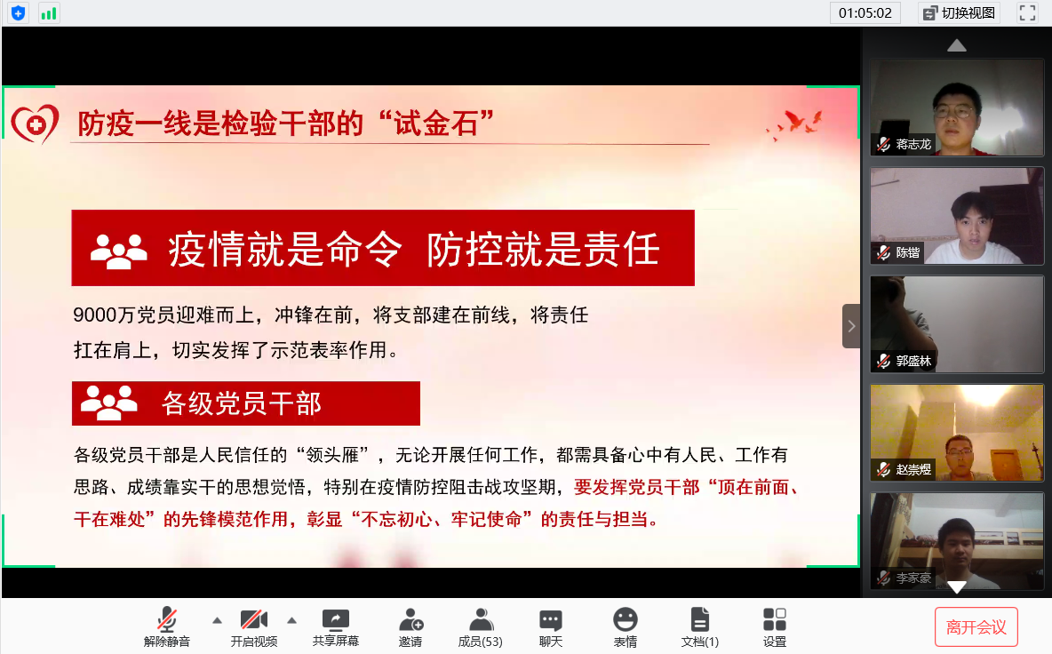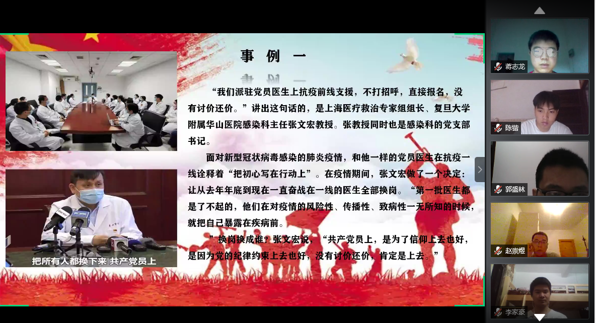本次党课通过线上研讨的形式,学习了疫情期间优秀党员先进事迹,大家深刻认识到共产党员在困难来临时应如何发挥先锋模范带头作用,看到了在抗击疫情过程中共产党员践行初心使命的具体表现,唤醒了同学们强烈的使命感和责任感,更加坚定了努力成为一位优秀共产党员的决心。