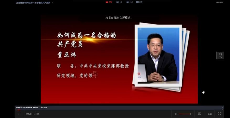 紧接着,学员们一同观看了董亚炜教授以“学习如何成为一名合格的共产党员”为题的教学视频。董教授以如何理解党的性质与党的总纲、如何理解党的宗旨和党组织为内容,引领激发同学们深刻认识到我们的成长发展建立在国家国情的基础上,我们要树牢“四个意识”,坚定“四个自信”,做到“两个维护”,共产党员有崇高而光荣的使命,要坚持走群众路线,从群众中来,到群众和中去,要始终代表中国最广大人民的根本利益,全心全意为人民服务。