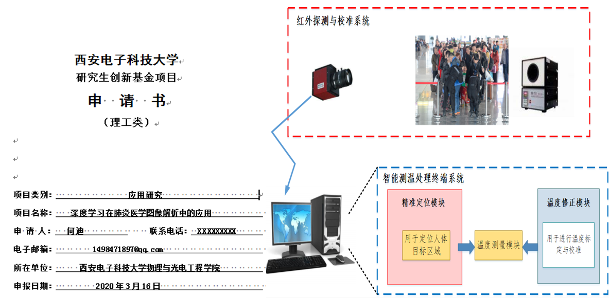 随着疫情防控暴露出的科学问题越发明晰,公司研究生结合学科方向,开展了大量的疫情防控科研创新。18级硕士何迪,基于深度学习人工智能技术在肺炎医学图像的解析方面进行了深入思考,以期对现有的CAD系统模型进行优化,于日前向公司提交了创新基金项目申请。18级博士张嘉嘉,在课题组火苗探测研究课题的基础上进行技术移植,对异常人员检测和跟踪技术进行了探索。