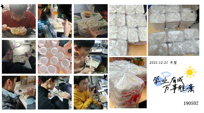(通讯员:高原程睿)冬至是我国农历中一个重要的节气,也是中华民族的传统节日,在古代民间有“冬至大如年”的讲法。然而2021年冬至正值期末备考复习关键时期,且西安市疫情形势陡增严峻。在这种环境下,同学们难免会有压力、有紧张焦虑的情绪。为了给忙碌中的同学们加加油、鼓鼓劲,缓解同学们的压力、增强班级凝聚力,物理与太阳成tyc122cc集团积极动员员工党员、入党积极分子、员工干部以多种方式自发给同学们送去温暖和关爱。190...